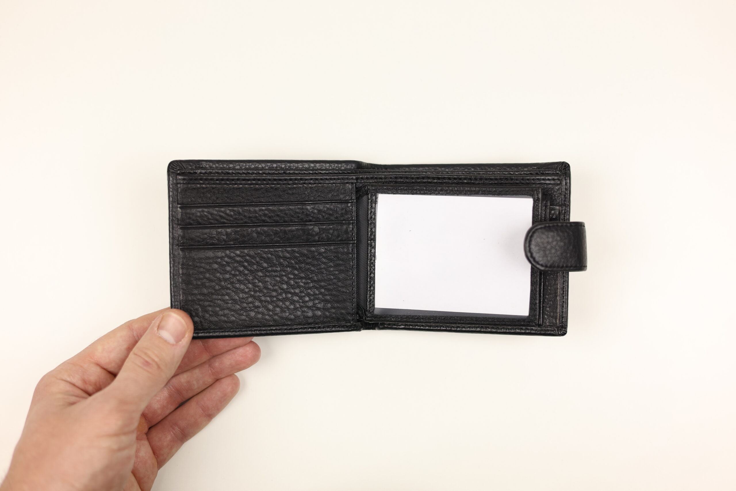 ✅ Відкидний блок (1 вікно): Ліва частина має відкидний клапан. На клапані розташовані слоти для карт, а під ним — одне велике прозоре віконце для посвідчення водія або ID-картки.