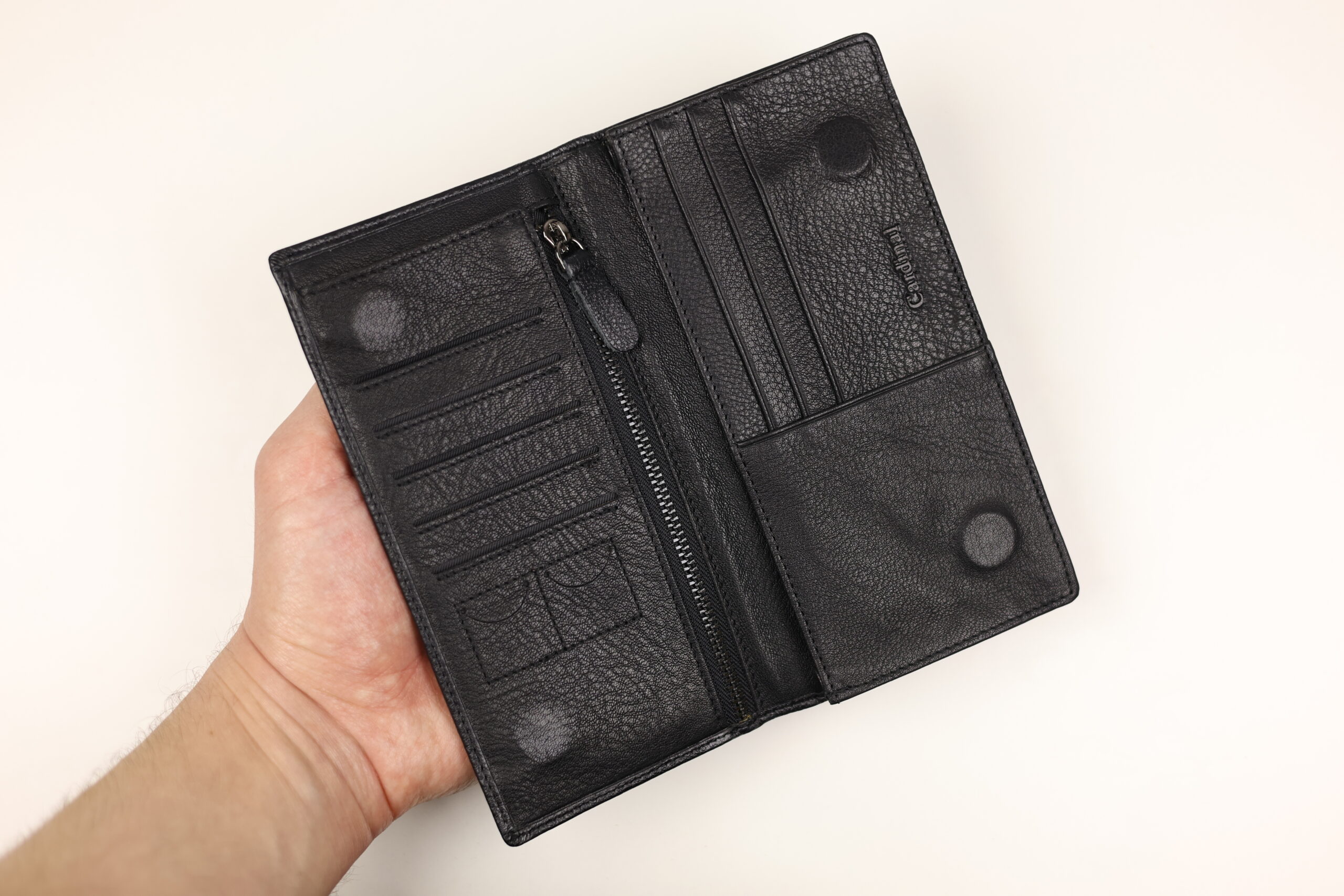 Цей чорний клатч купюрник Cardinal — вибір чоловіків, які цінують порядок і статус. Подовжений вертикальний формат (“Breast Wallet”) дозволяє зберігати банкноти будь-якого номіналу ідеально рівними, не згинаючи їх.